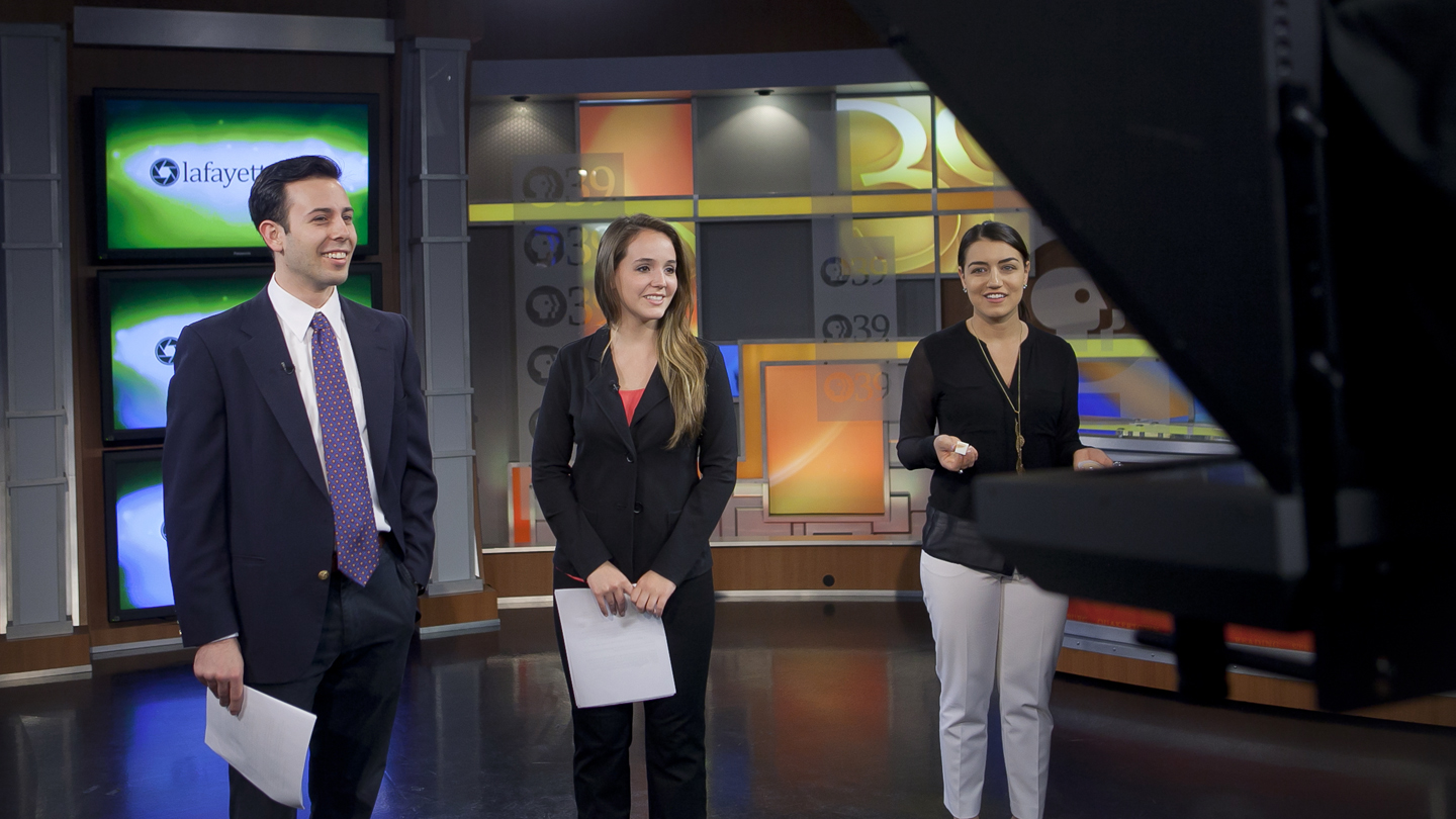 Along with Kidane Kinney ’15, policy studies major Edward O’Brien ’16 (Lake Hopatcong, N.J.) anchored the broadcast. The PBS professionals set a high bar, holding the students to the same production standards they expect of themselves and providing a learning experience that a classroom cannot replace.