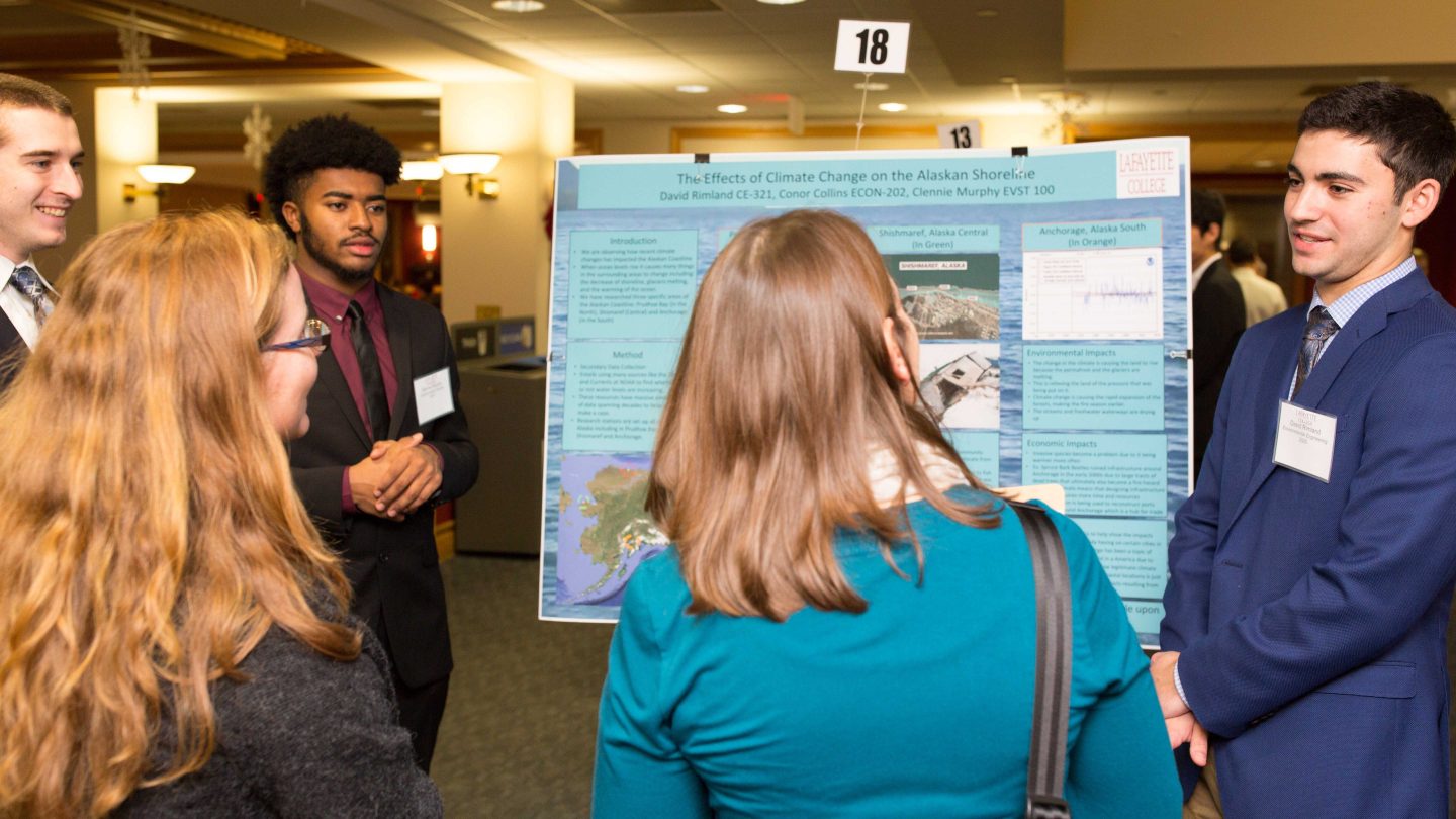 Surrounding each poster is an interdisciplinary mix of students from three participating classes: Environmental Engineering and Science, Environmental Economics, and Introduction to the Environment.