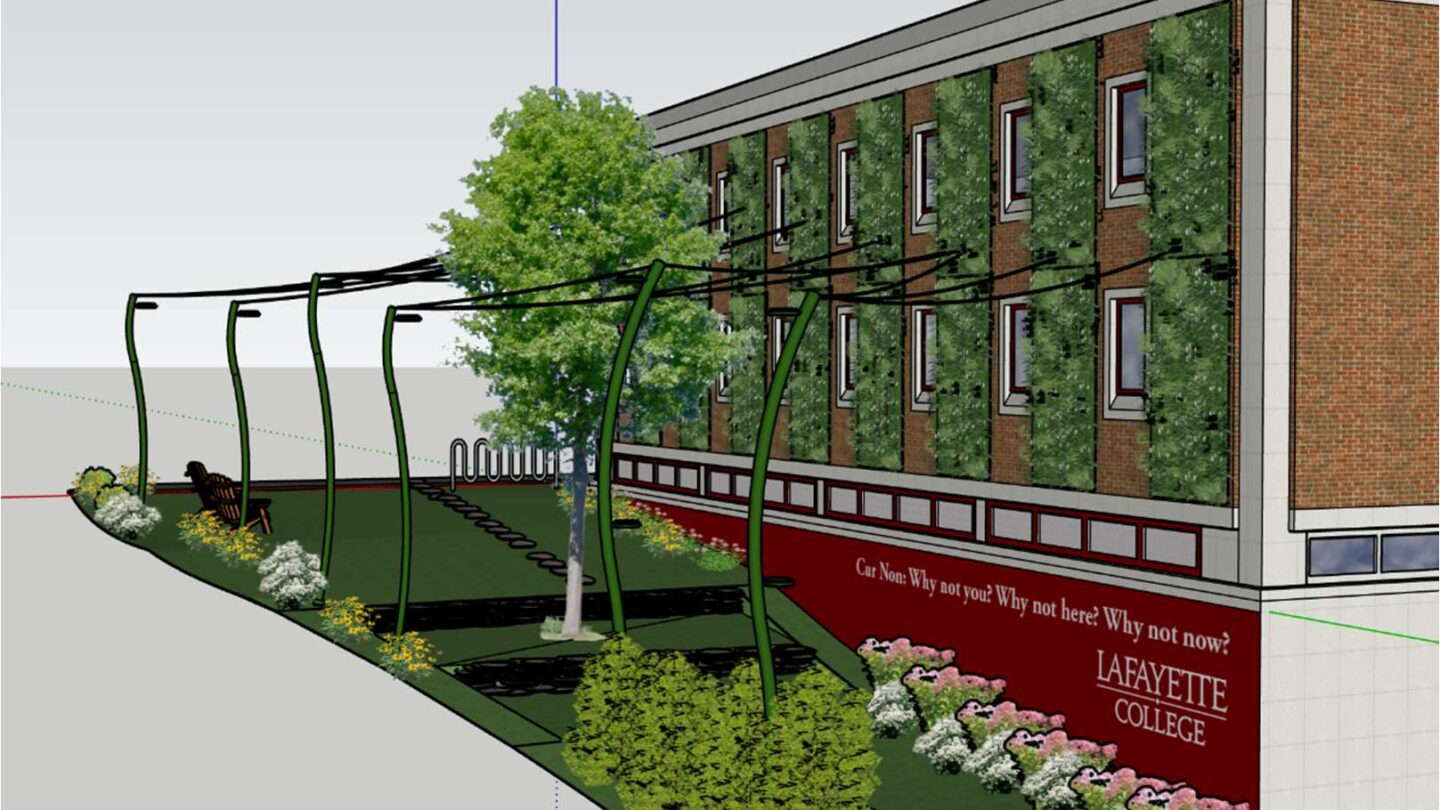 Students in Prof. Benjamin Cohen’s upper-level, project-based Sustainable Solutions class this spring finalized a comprehensive proposal to build a living wall and an adjacent communal garden space on the northeast side of Acopian. Alive with native plants, Lafayette Gardens would create an oasis designed to facilitate education, recreation, and place-making opportunities on campus.